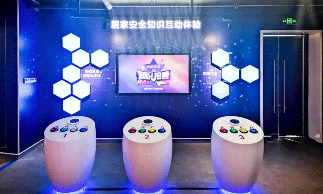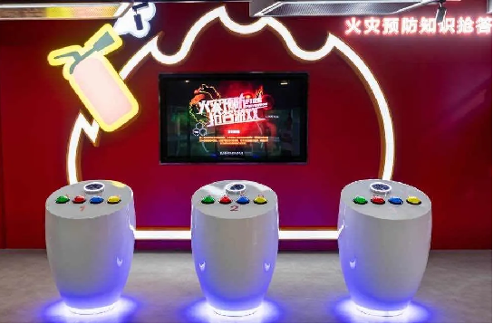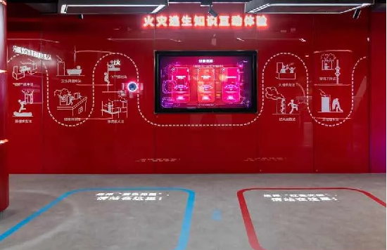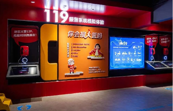 消防安全体验区根据火灾预防理念,共设置8个展项,全面覆盖从火灾发生前预防知识学习,到发现火情进行报警、初期灭火,最后火场逃生的整个场景。